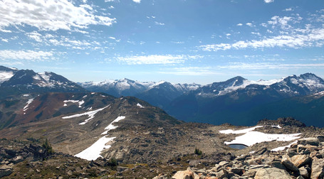 The peak chair express lift was not open for the 2020 season so in order to get to the trail head, I took the gondola up to Roundhouse Lodge on Whistler mountain, and trekked up Pika's Traverse and Mathew's Traverse. That took me close to an hour because it was steep incline with almost no flat ground at all, and the reason why I clocked in at a higher distance travelled. This path was full of loose rocks as well so that slowed me down. Some of the ice has not completely melted so it was interesting to see giant chunks of ice underneath the hot sun.